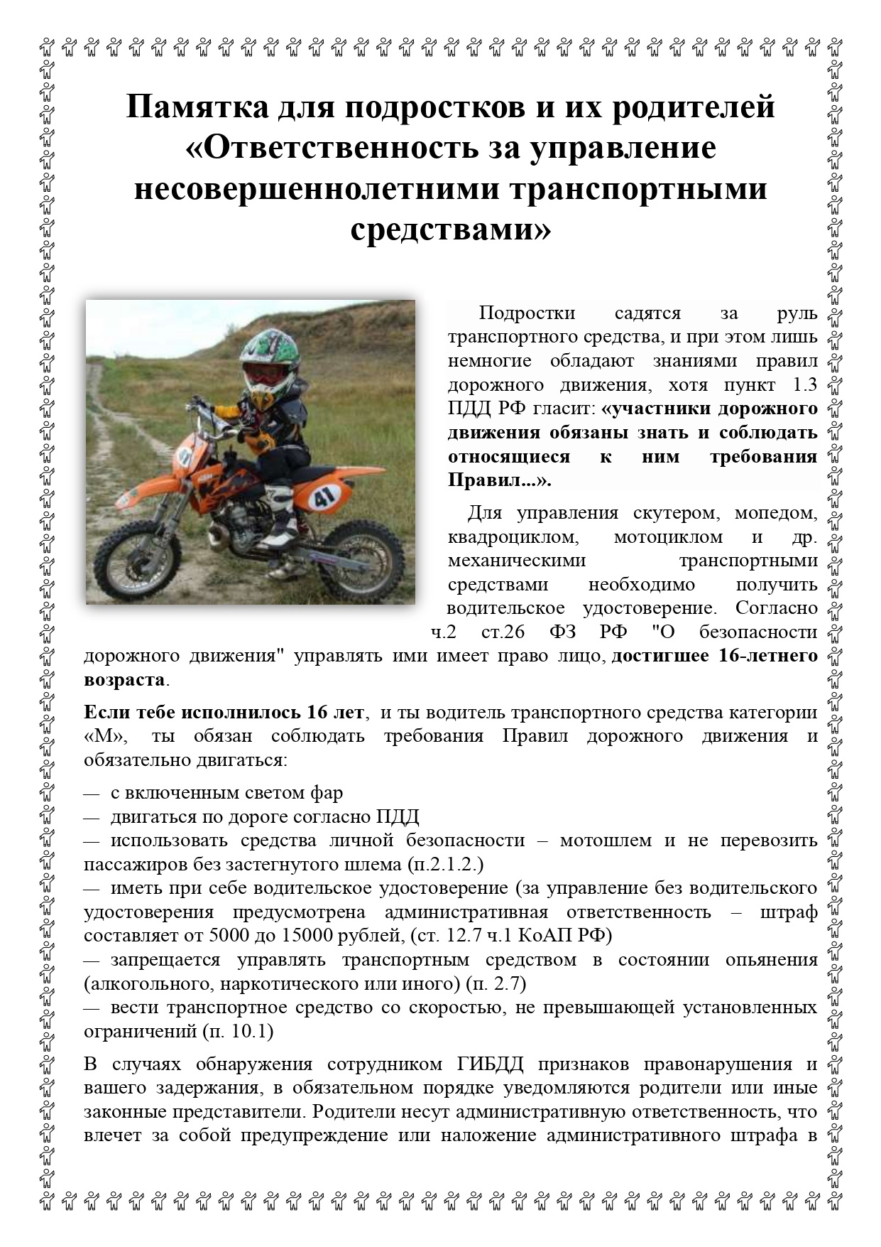 Памятка по профилактике совершения несовершеннолетними правонарушений в сфере дорожного движения.