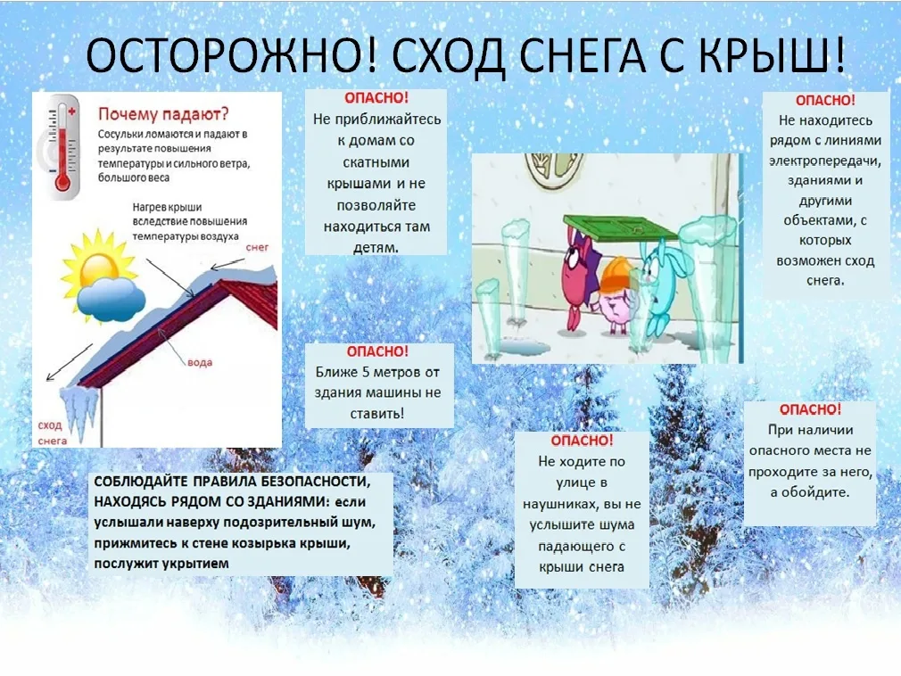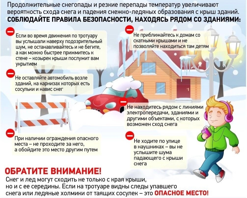 Памятка по безопасному поведению во время падения снега и сосулек с крыш зданий!