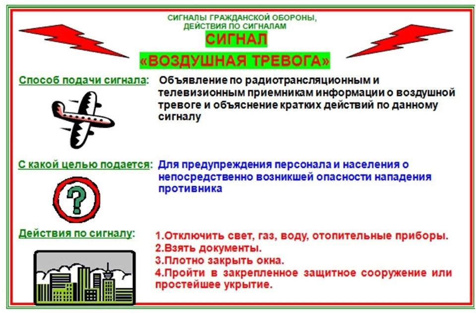Услышав предупредительный сигнал гражданской обороны «ВНИМАНИЕ ВСЕМ!» необходимо включить телевизор, радиоприемник, на волнах которых в течение от 2 до 5 минут транслируется сообщение: «Внимание! Говорит оперативный дежурный Курской области! Граждане, Воздушная тревога!», далее до населения доводится порядок действий. Прослушав сообщение, действовать необходимо быстро, без паники.