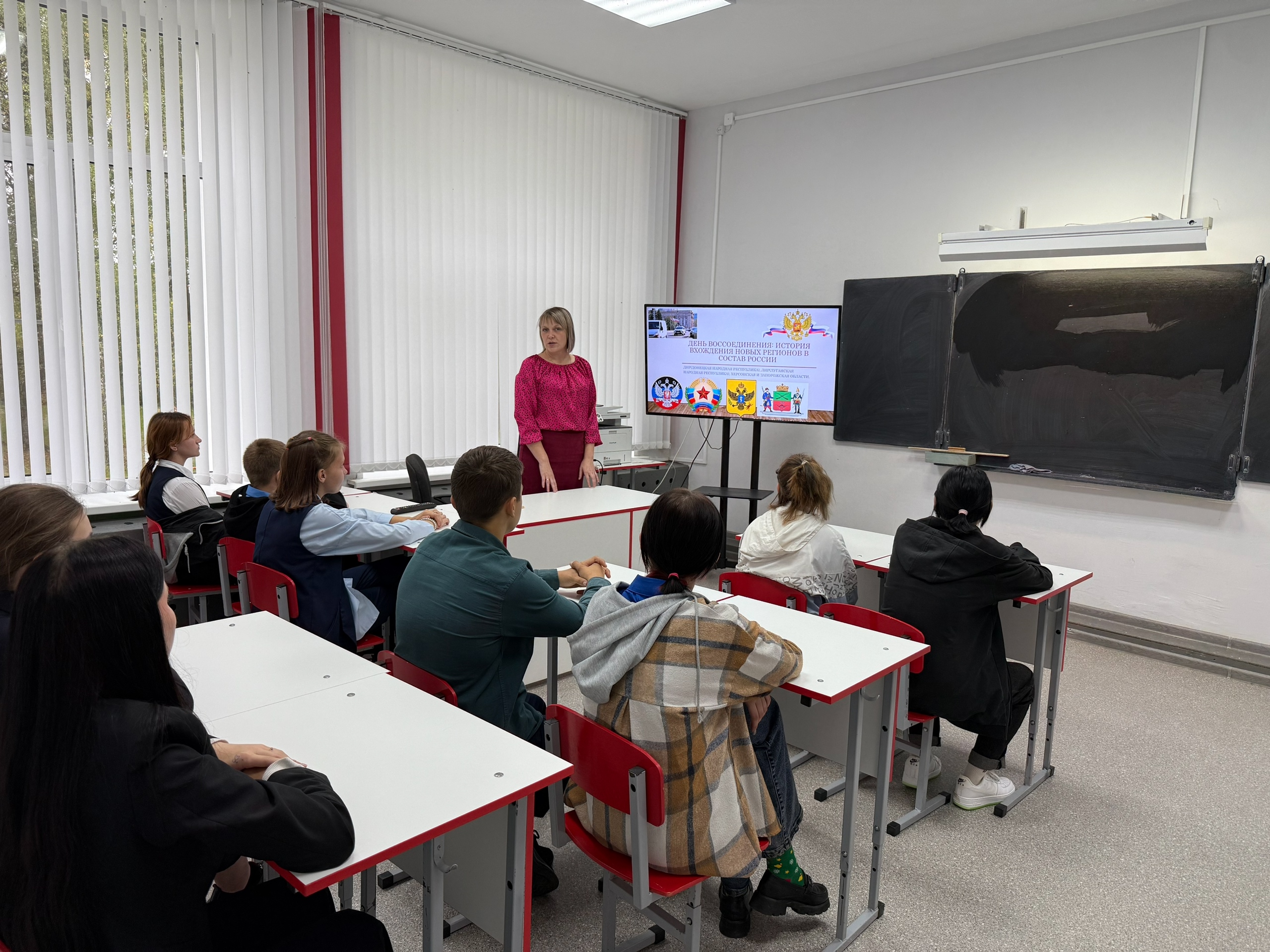 Учитель истории Плахова Наталья Витальевна провела увлекательный тематический урок, в ходе которого учащиеся узнали о значении этого события для нашей страны и о процессе вхождения новых регионов в состав России.